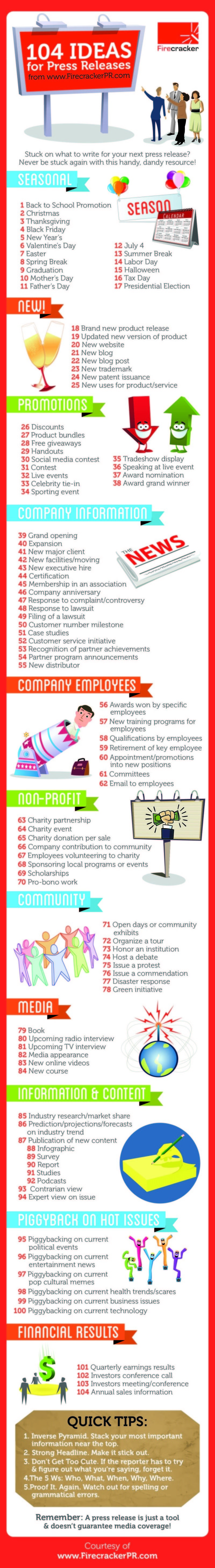 Never run out of ideas for writing press releases! Here are 104 ideas to get your brain going.
